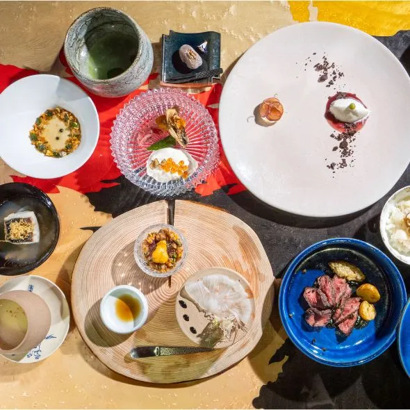 Sajiki, Aman no Shokutaku’s second-floor restaurant, serves Japanese hotpot dishes like sukiyaki, as well as teppanyaki, where high-quality ingredients such as Awaji Beef, abalone, and Japanese spiny lobster are prepared in front of guests. Savor a sumptuous meal while enjoying the ultimate performance as the chef deftly demonstrates his skills.