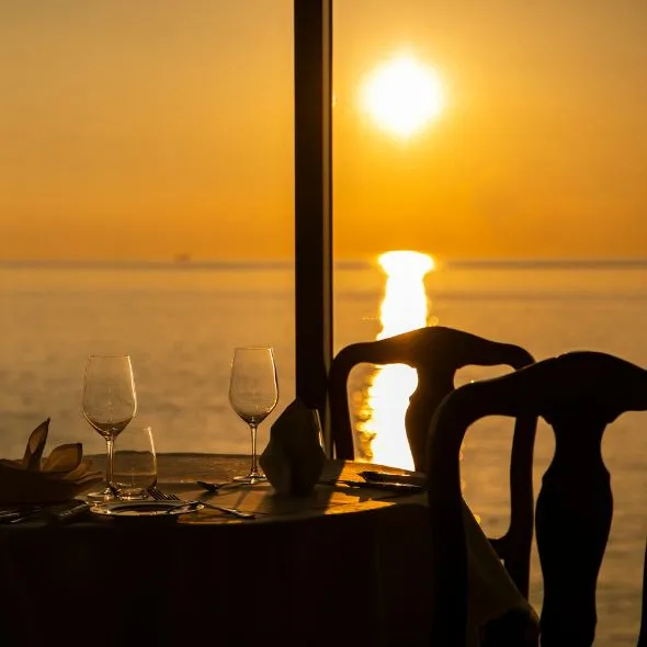 Aonoya, one of the restaurants at SEIKAIHA theater and restaurant complex, is a Japanese restaurant, featuring sushi and tempura. Inside, the tiered, step-like seating is designed so that every seat faces the sea. The walls are made of glass, allowing uninterrupted views.
