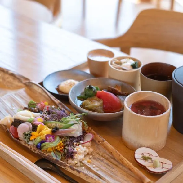 Haru San San’s cuisine showcases the bounty of Awaji Island, with a particular emphasis on fresh vegetables grown on our own farm. The menu was created through the collaboration of Masayuki Okuda, selected as one of the “1,000 Chefs of the World,” and Nobuaki Fushiki, a specialist in fermented cuisine. Every dish makes the most of seasonal, locally sourced ingredients. Farm products from the island, seafood from the surrounding seas, and fruits and vegetables harvested just steps from your table come together to offer an authentic taste of Awaji Island.