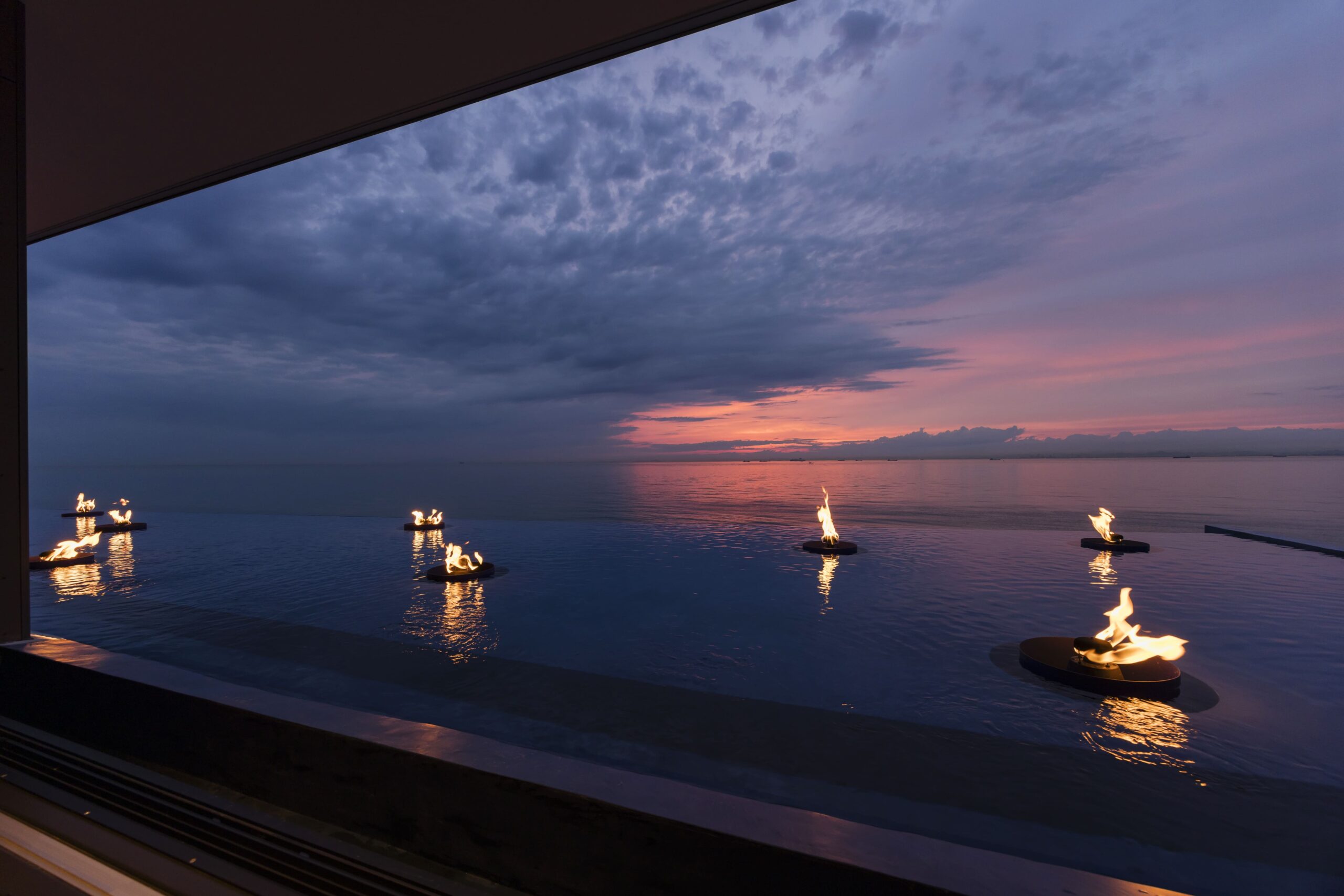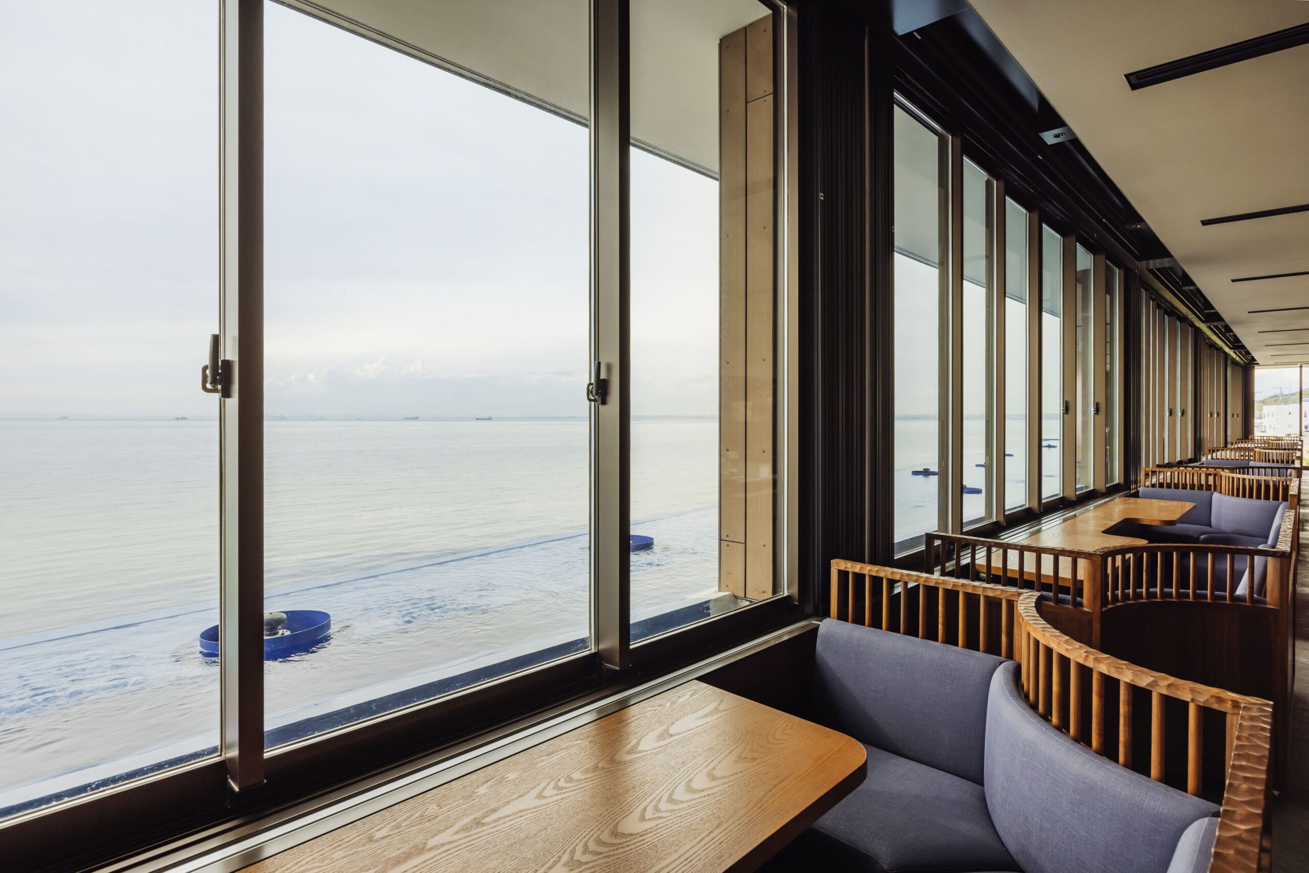 Large windows open onto serene views of Harima-nada Sea and the colors of the sky, which generate a soothing and inviting ambiance.
