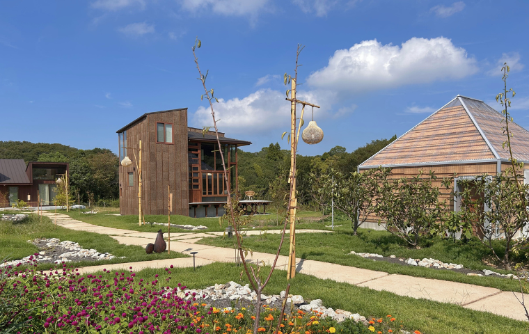 Farming Resort San San Villa is quietly nestled among the lush hills of Awaji Island. From sunlight softly filtering through the trees, to gentle, soothing breezes, the rhythms of nature intertwine with everyday life at this special resort. Architects from Japan and abroad designed each villa to bring out the warmth of natural materials. Each of the 10 villas is a "one-of-a-kind space unlike any other."